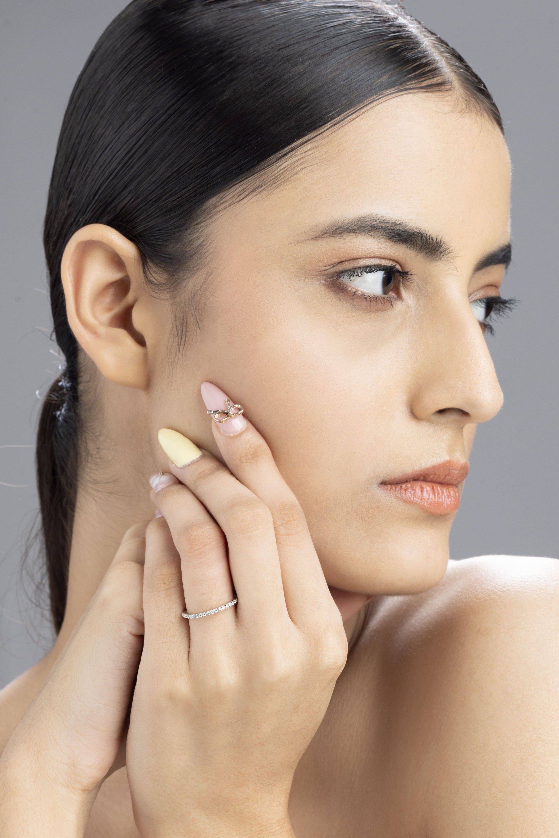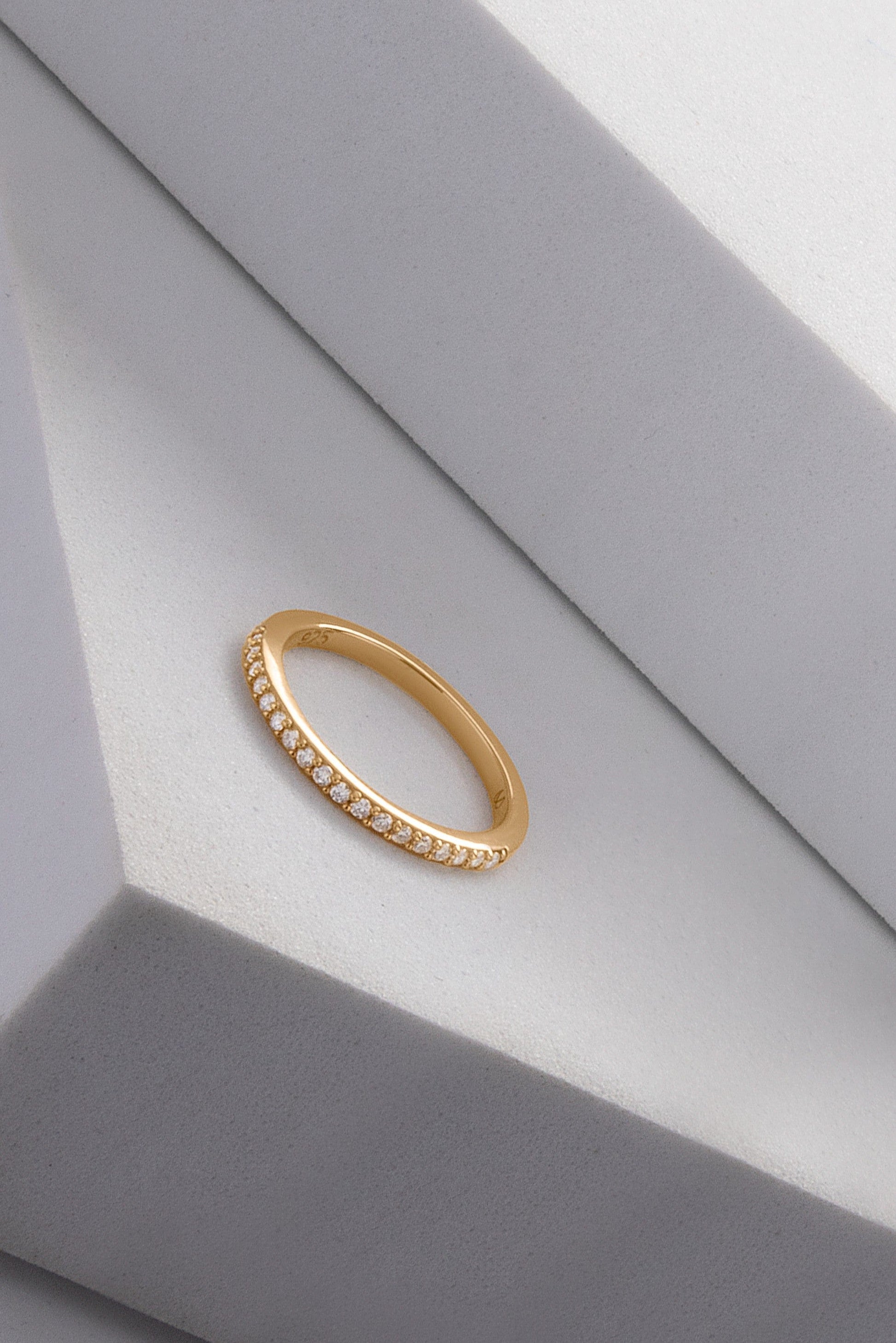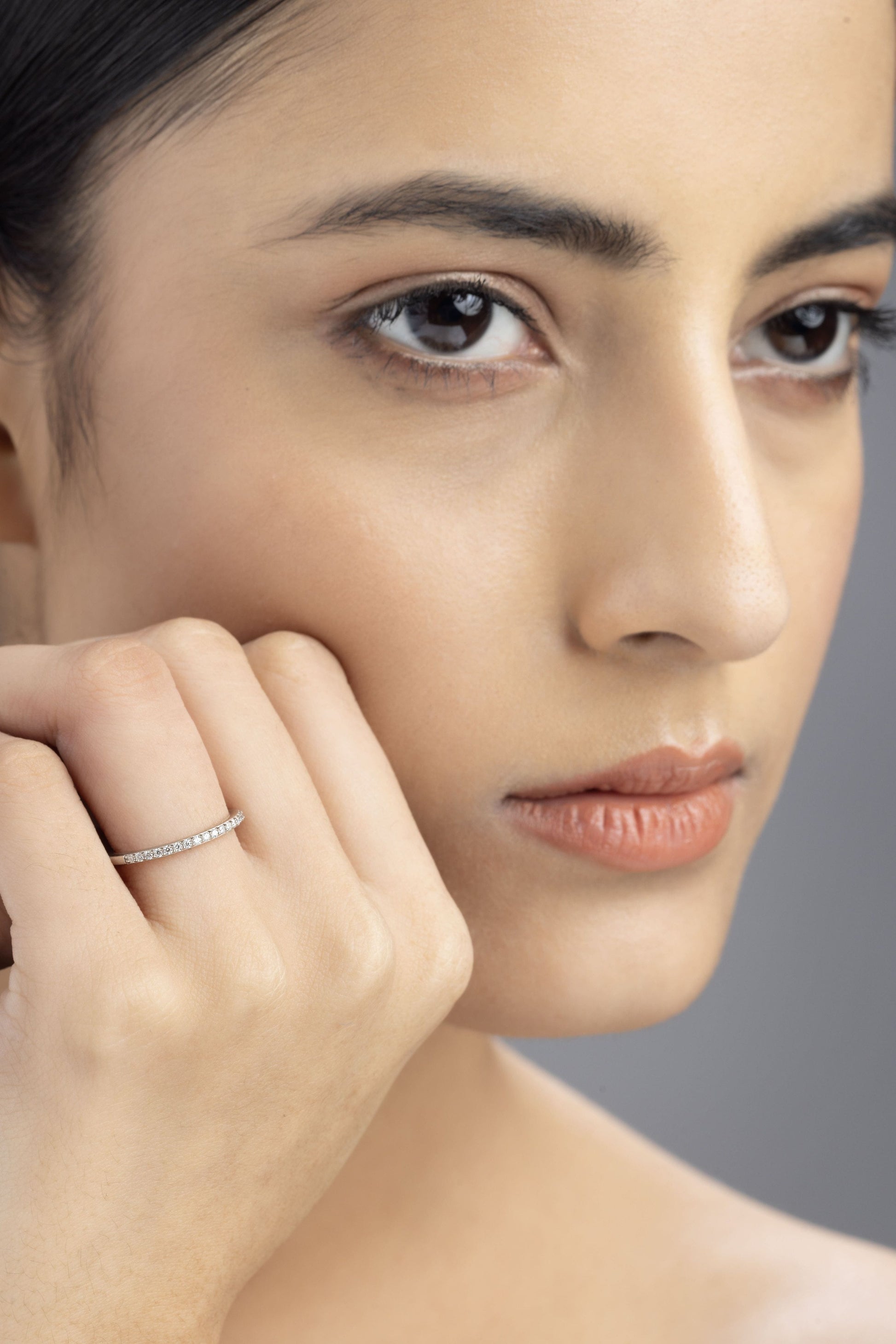 Subtle sparkle for every stack — the Lustre Pavé Band is lined with 18 round moissanites in 925 sterling silver, totaling 0.36 carats. A delicate accent ring designed to shine on its own or elevate your stack.