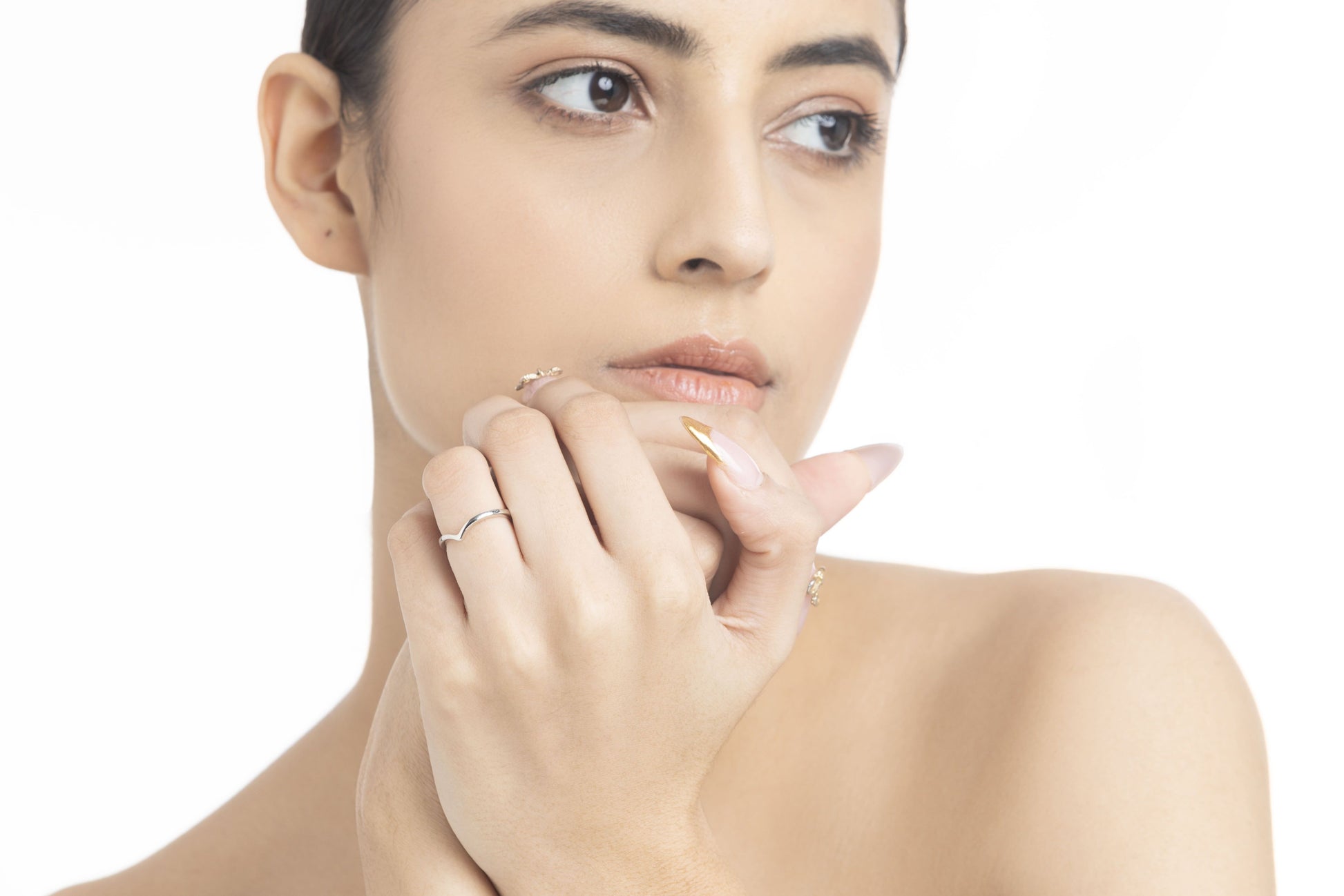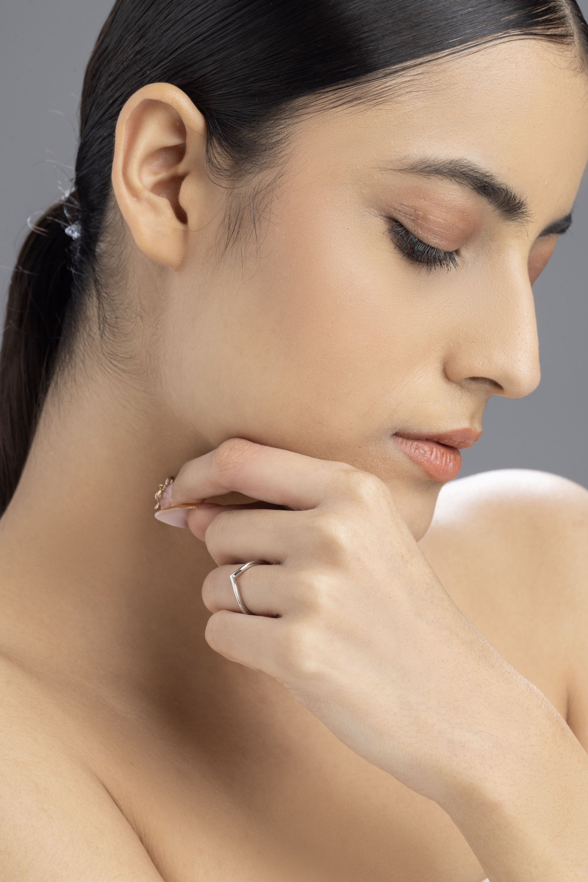 Graceful geometry — the Vesta Chevron Band is crafted in 925 sterling silver with a sleek V-shaped silhouette. Minimal yet striking, it’s a versatile essential for stacking or wearing solo.